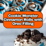 Keywords: cookie monster cinnamon rolls, blue cinnamon rolls, cinnamon roll recipe, cream cheese icing cinnamon rolls, Oreo cinnamon rolls, fun breakfast recipe, cinnamon rolls with cookies