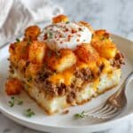 - Combine with Potatoes: In a large mixing bowl, combine the diced potatoes with the beef mixture. Add the sour cream and half of the shredded cheddar cheese. Fold gently until everything is well incorporated.