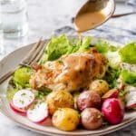 A white plate with a crispy cooked chicken breast placed in the center, topped with a glossy light brown sauce being poured from a spoon above. Around the chicken, there are halved small red and yellow potatoes with a shiny surface and sprinkled with green herbs. The bottom layer of the plate is filled with fresh green lettuce leaves mixed with sliced radishes showing white and red colors, and a few sliced green onions. The background is a white marbled texture, and a woman’s hand holds the spoon pouring the sauce. Two forks rest on the side of the plate, and glasses of water appear blurred on the edges. photo taken with an iphone --ar 4:5 --v 7